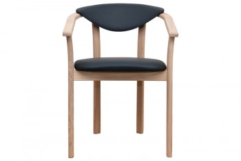 Massiver, weißgeölter Armstuhl aus Eichenholz mit echtem wohlriechendem Leder in Schwarz, sowohl auf dem Sitz als auch in der Rückenlehne. Der Daisy Stuhl gewährt eine gute Rückenstütze, und der Benutzer kann stundenlang darauf sitzen – egal ob man bei dem Tisch isst oder vor dem Kamin sich entspannt.